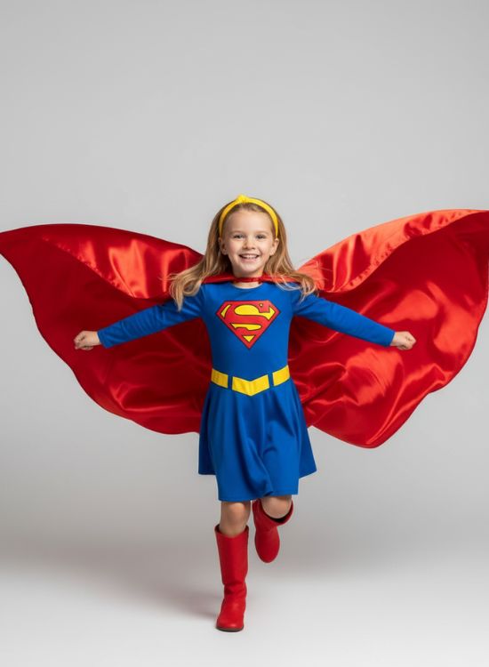 - Supergirl Dress: A vibrant blue dress with the classic “S” emblem. Lightweight and soft, it allows children to move freely while looking heroic.